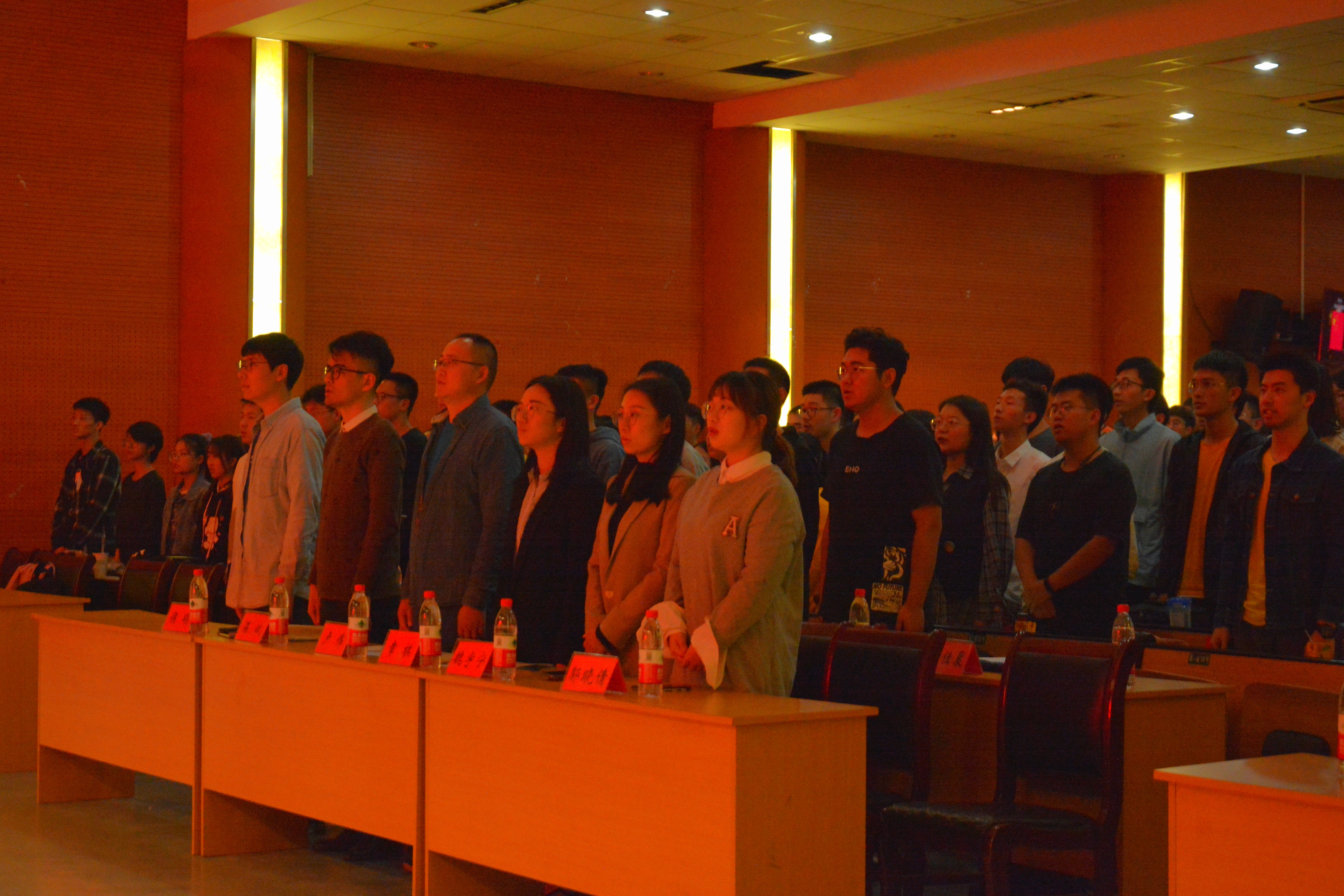 会议第一项,全体起立,奏国歌。伴随着庄严的国歌声,全体老师和同学们都面向国旗合唱,向国家和党表达着最崇高的敬意。