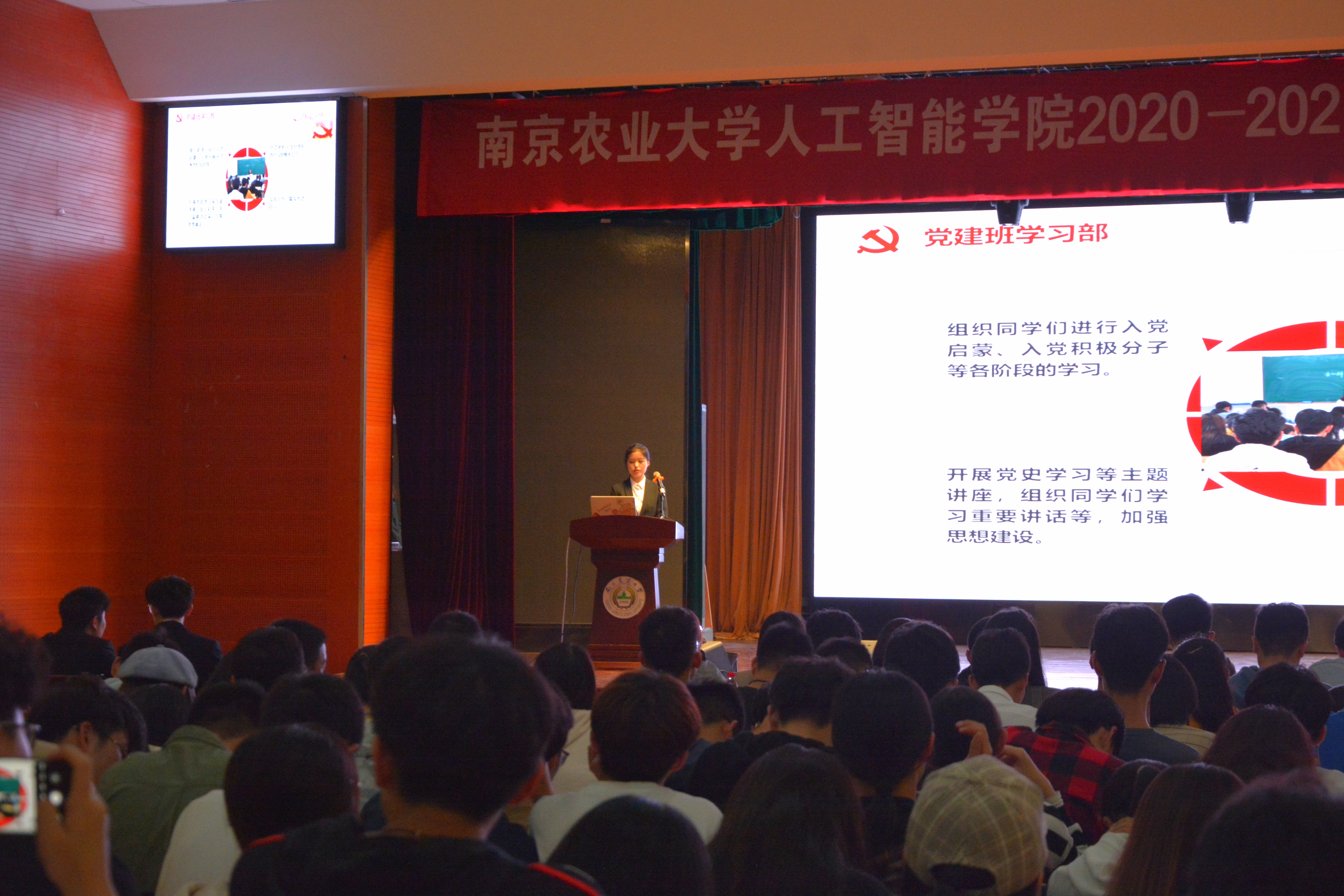 学生干部任用名单。随后,分党校秘书长王雨祺、院团委学生副书记王禹博、院学生会主席钟佳晨、全媒体中心主任李启源、AI工作坊主席仝曦熳依次上台,介绍了各部门职能及工作安排,并宣读了副部及以上的成员名单。最后,进行大会第五项,全体起立,奏唱南京农业大学校歌。至此,本次全体学生干部大会圆满结束。