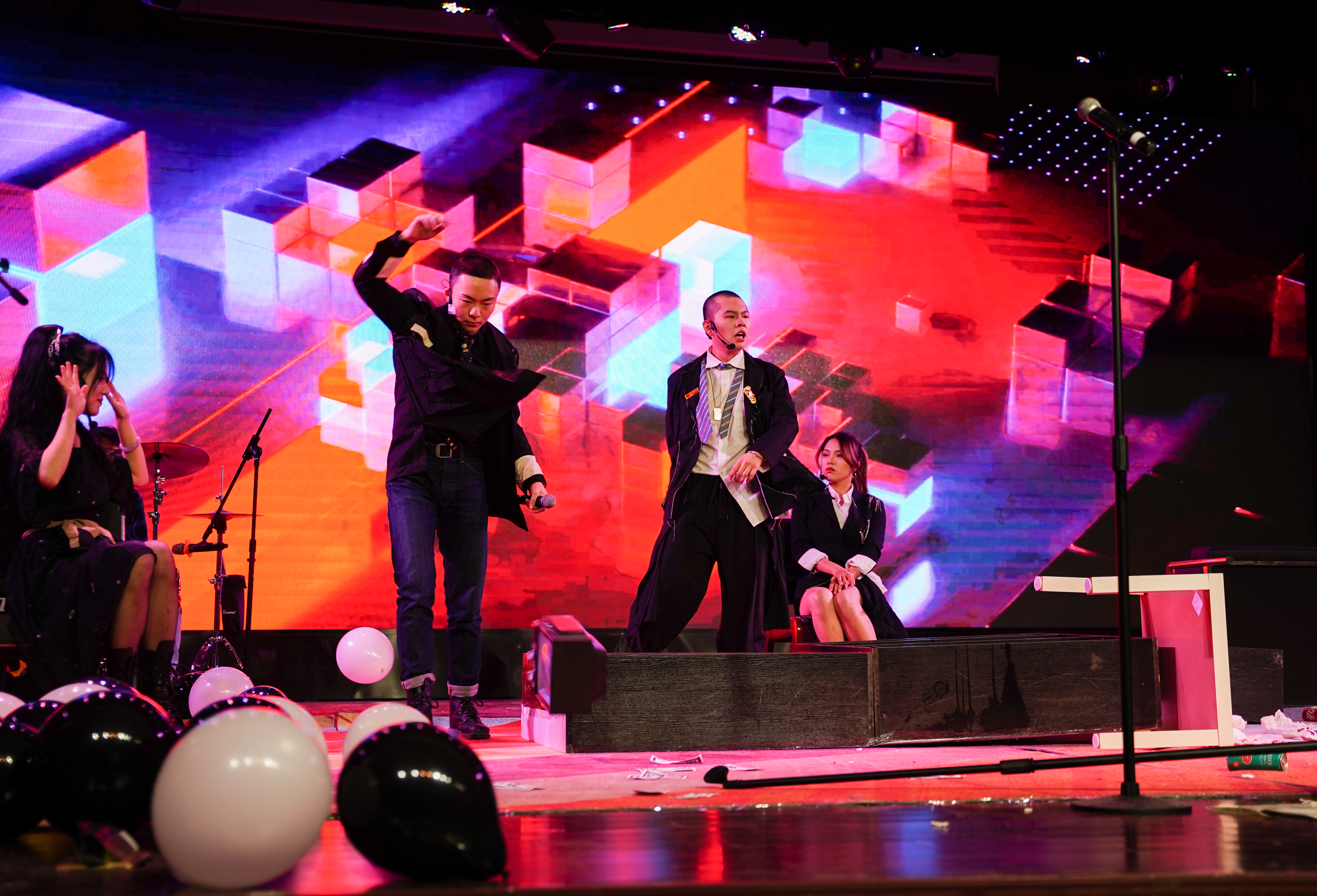 的教师代表及500余名学生共同欣赏了这场视听盛宴。演出在震撼的摇滚乐中拉开序幕,演员们全身心的表演与经典的台词,让观众们对这部话剧有了深刻的理解。《戈多小姐的孤独之心俱乐部》不仅批判女德,倡导女性不被落后观念束缚,也鼓励人们在面对不良现象时敢于发声,获得现场观众不断的掌声。最终,话剧在观众的高呼中完美落幕。