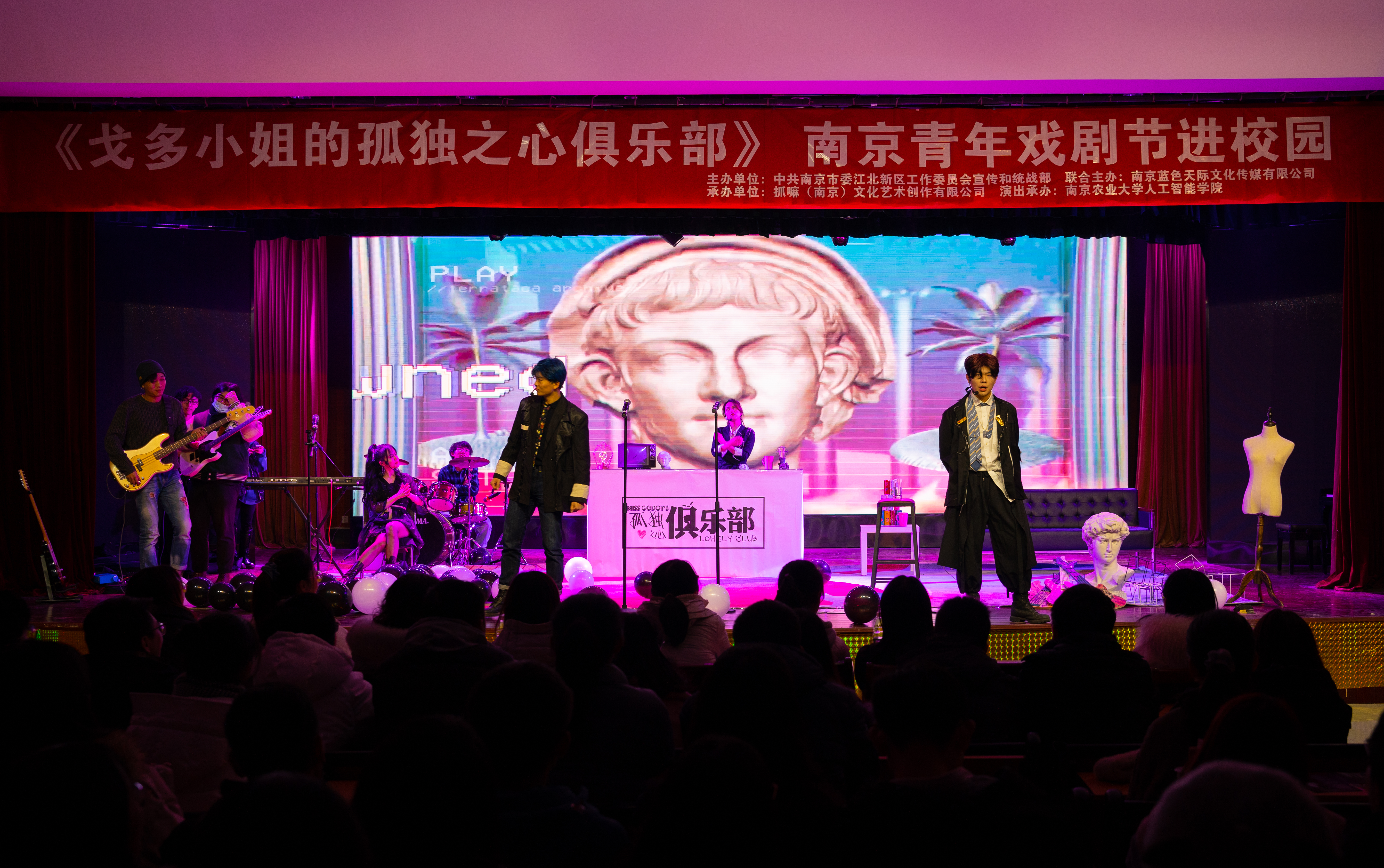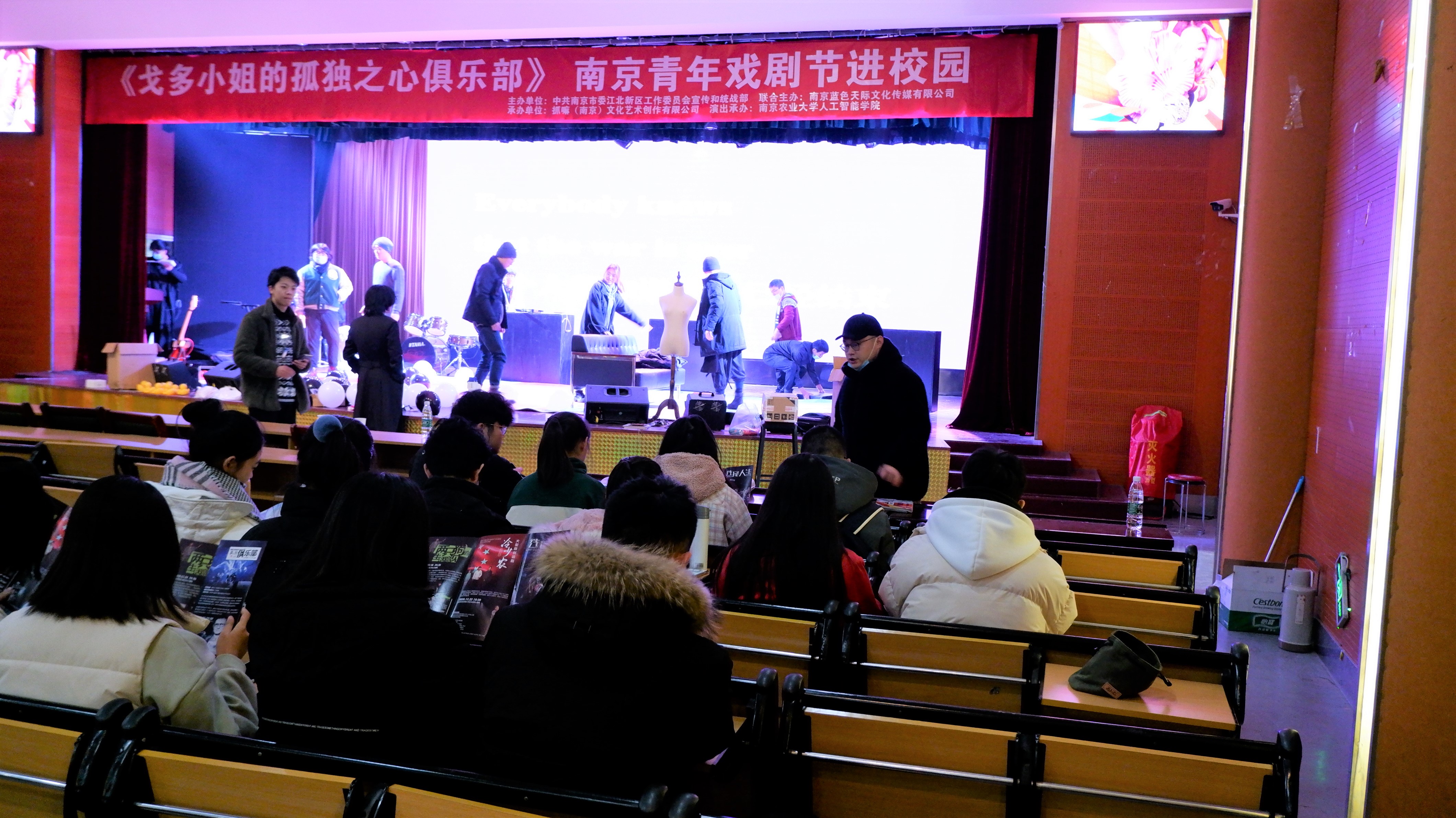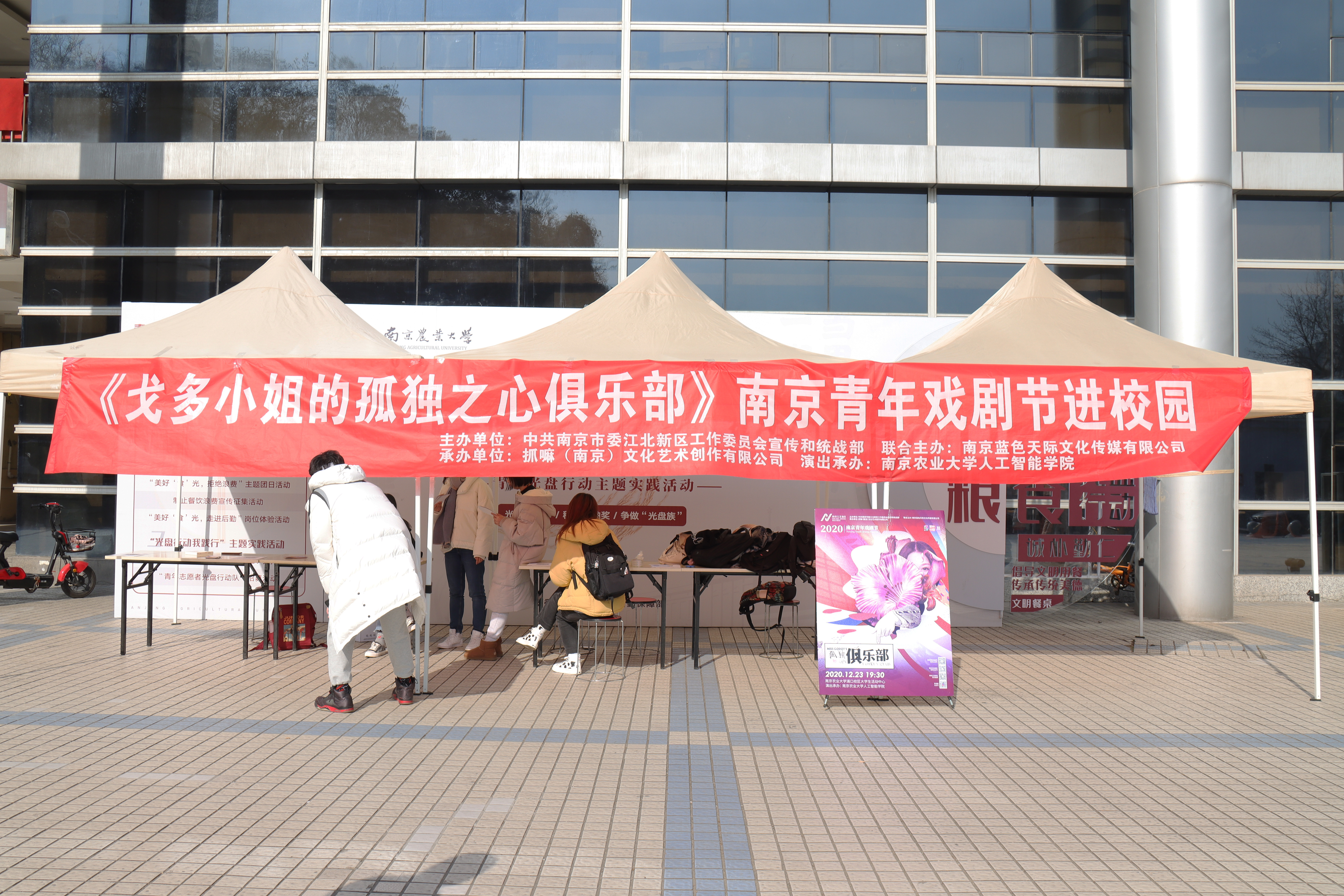 承办的“南京青年戏剧节进校园”活动在浦口校区开展。活动分为广场宣传、排练开放日、《戈多小姐的孤独之心俱乐部》话剧演出、戏剧放映会四部分。
