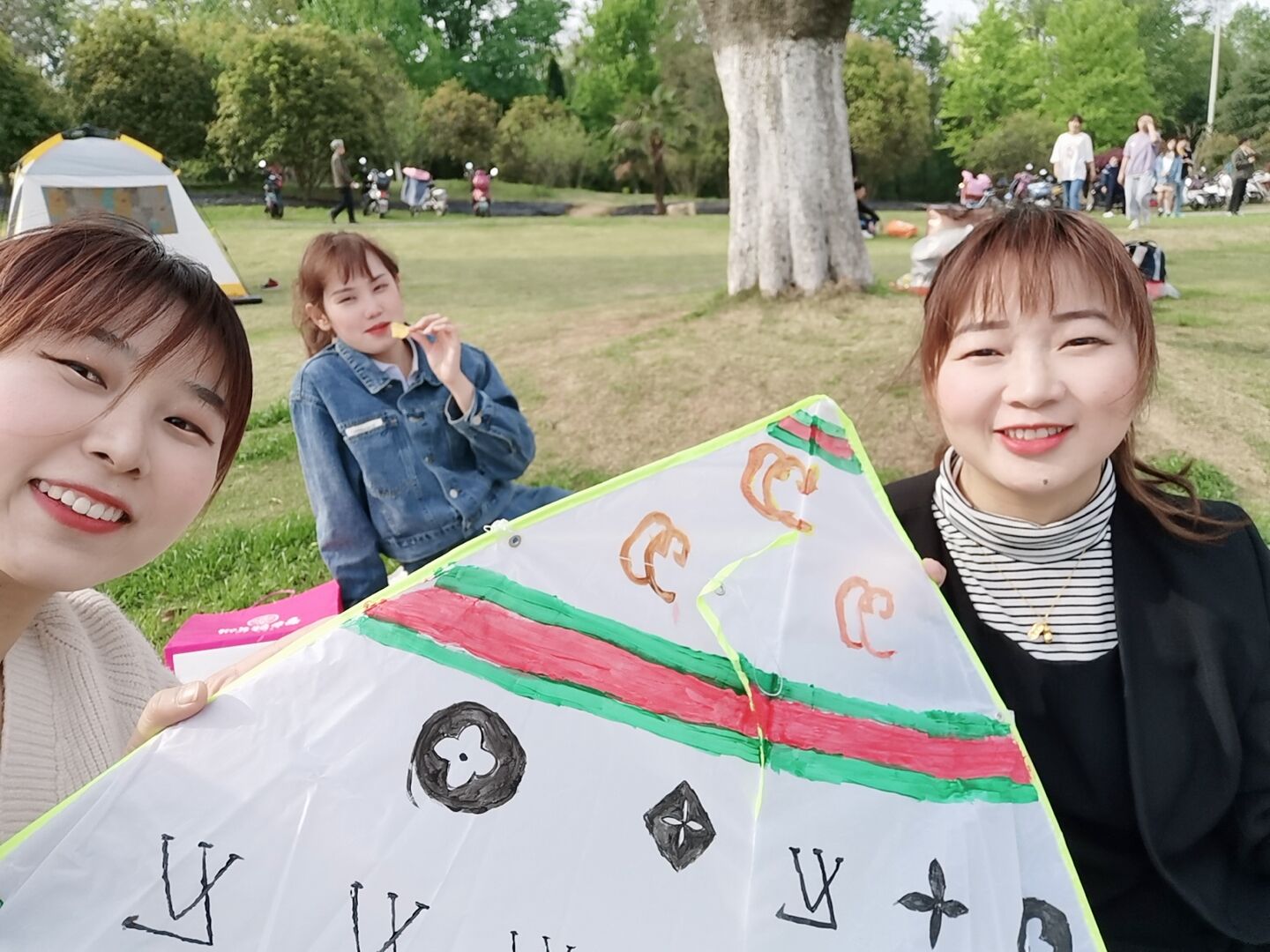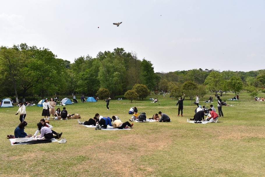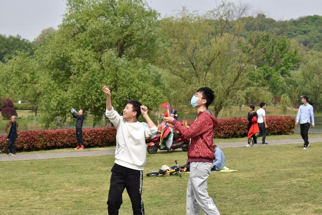 下午1点40分,在工作人员的组织下,同学们来到中山陵博爱园,有序领取材料,并进行风筝的制作。