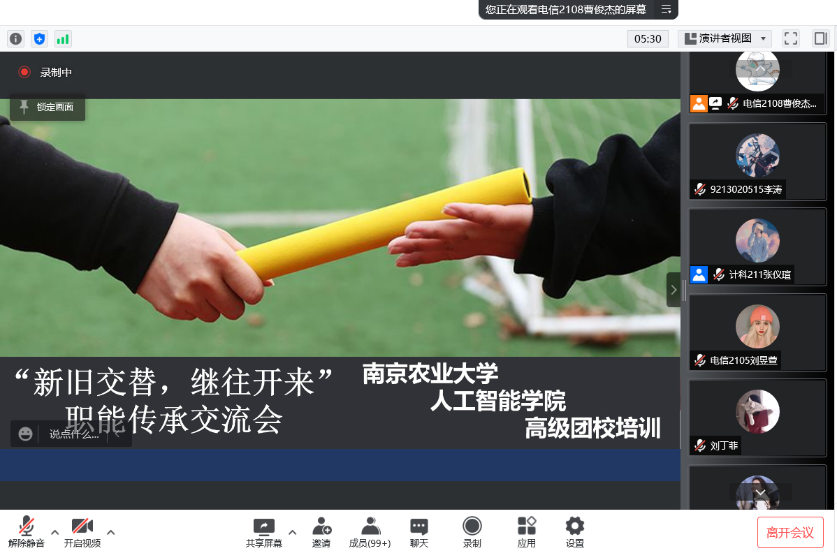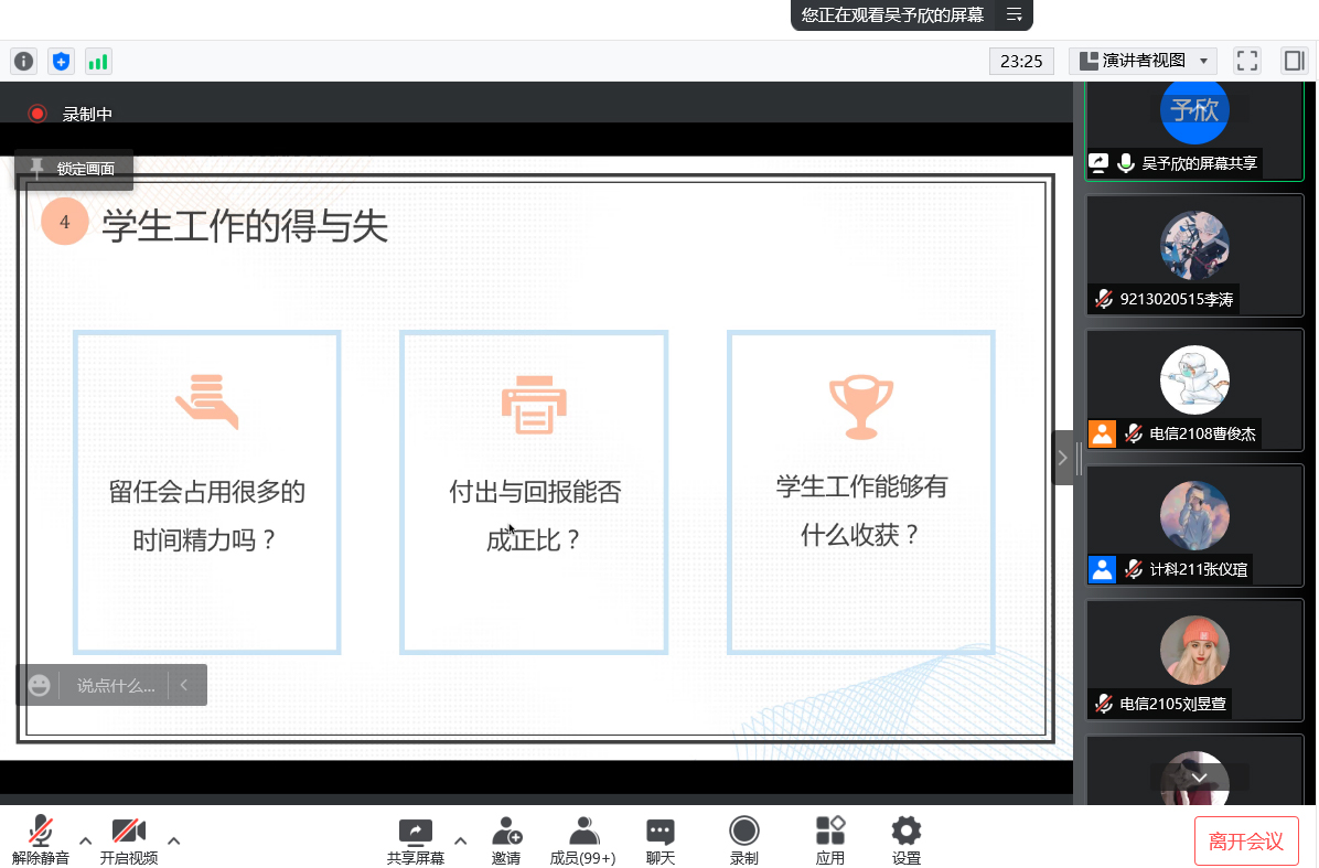 会议开始,吴予欣先从身份转变、审核标准、活动开展和学生工作的得与失四个方面介绍学生工作中的相关内容,同时分享了在学生工作中的经验。紧接着,任素慧从自己留任部门的相关经历出发,针对干事和部长的生活学习方面等给出了一些建议,并对评论区的提问给予详细的回答。为了让同学们对职能传承有更深刻的了解,施芸芸向同学们介绍学生组织职能变化、学生干部的综合素质要求以及学生工作的意义。最后,主持人对本次交流会进行了简要的总结,并宣布会议结束。
