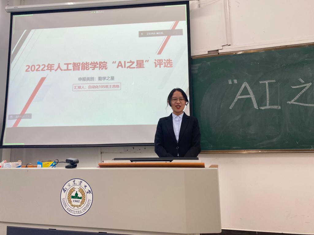辅导员魏宇宁、邬晓倩,信息管理学院研究生会主席孙婷婷,2020-2021学年度“AI之星”代表仝曦熳出席并担任评委。12名候选人分别进行3分钟的个人展示,自强之星竞选者汪再冉面对转专业后巨大的专业课压力并未选择“躺平”,而是不断克服困难,直面挑战。目前成绩排名专业第7,完美诠释自强之星的良好品质。勤学之星竞选者王茜格、江志健、王琬婷,均位列专业第一,且很好地平衡了学习、科研、学生工作三者之间的关系,在专业学习中具有较好的榜样示范作用,同时能够帮助和带领同学共同进步。科研之星竞选者曹柏源、郭振涛、杨凯云、刘尚昆分别展示了自己在学校参与的各项科研项目,并均以第一作者发表论文并被中文核心期刊正刊、SCI等全文收录,为拉近学生与科研之间的距离起到了积极促进作用。服务之星竞选者王圣元、熊黄瑞不仅成绩优异,科研能力较强,且在学生组织、团务助理工作中积极主动,服务同学,帮助低年级学弟学妹答疑解惑、指引方向,充分发挥了学生干部的榜样引领作用。文体之星竞选者曹钰沆学习成绩优异、热爱运动,在校运动会等比赛中取得优异成绩,积极带动身边人参与体育锻炼,为学院营造良好的校园文化氛围发挥重要作用。最终,12名竞选者凭借自己的优异表现均获得“AI之星”称号。
