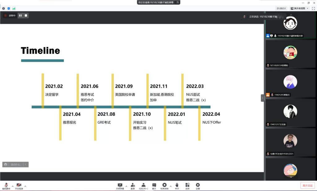 讲座开始,仝曦熳首先从香港留学教育入题,为我们介绍了香港大学的基本信息,并回答了留学该如何规划、香港适合哪些人群留学等方面的问题。同样从分享留学规划开始,邓博阳主要介绍了英国的大学环境并点明了去英国留学的必要条件,更强调对于留学应抱有积极态度。与前两位不同,颜子涵则是从个人经验出发,分享了自己申请留学的经历以及获得的教训,供同学们参考。之后,李启源在日本本土文化和教育制度两方面对赴日留学进行了分析,具体地阐释了留学日本的优势,给予同学们更多留学选择。此外,四位留学学子均留下了联系方式以便于和同学们更好地交流留学相关问题,讲座在一片欢声笑语之中结束。