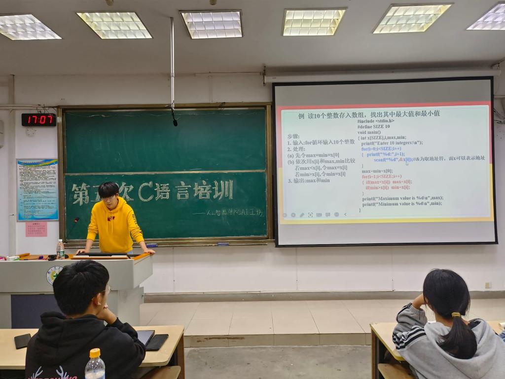 AI工坊和嵌入式物联网创新工作室联合举办的7次C语言培训圆满结束。“教学相长也。”在指导教师、优秀学生代表的精心讲解下,同学们对C语言的理解与应用的能力都有了显著提高。