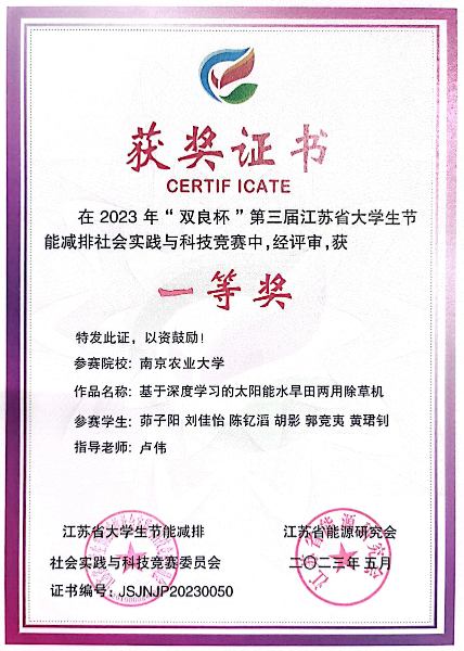 卢伟老师指导、茆子阳同学担任队长的学生团队参赛项目“基于深度学习的水旱田两用除草中耕机”经过专家评议和线下答辩,斩获大赛科技竞赛类作品一等奖。