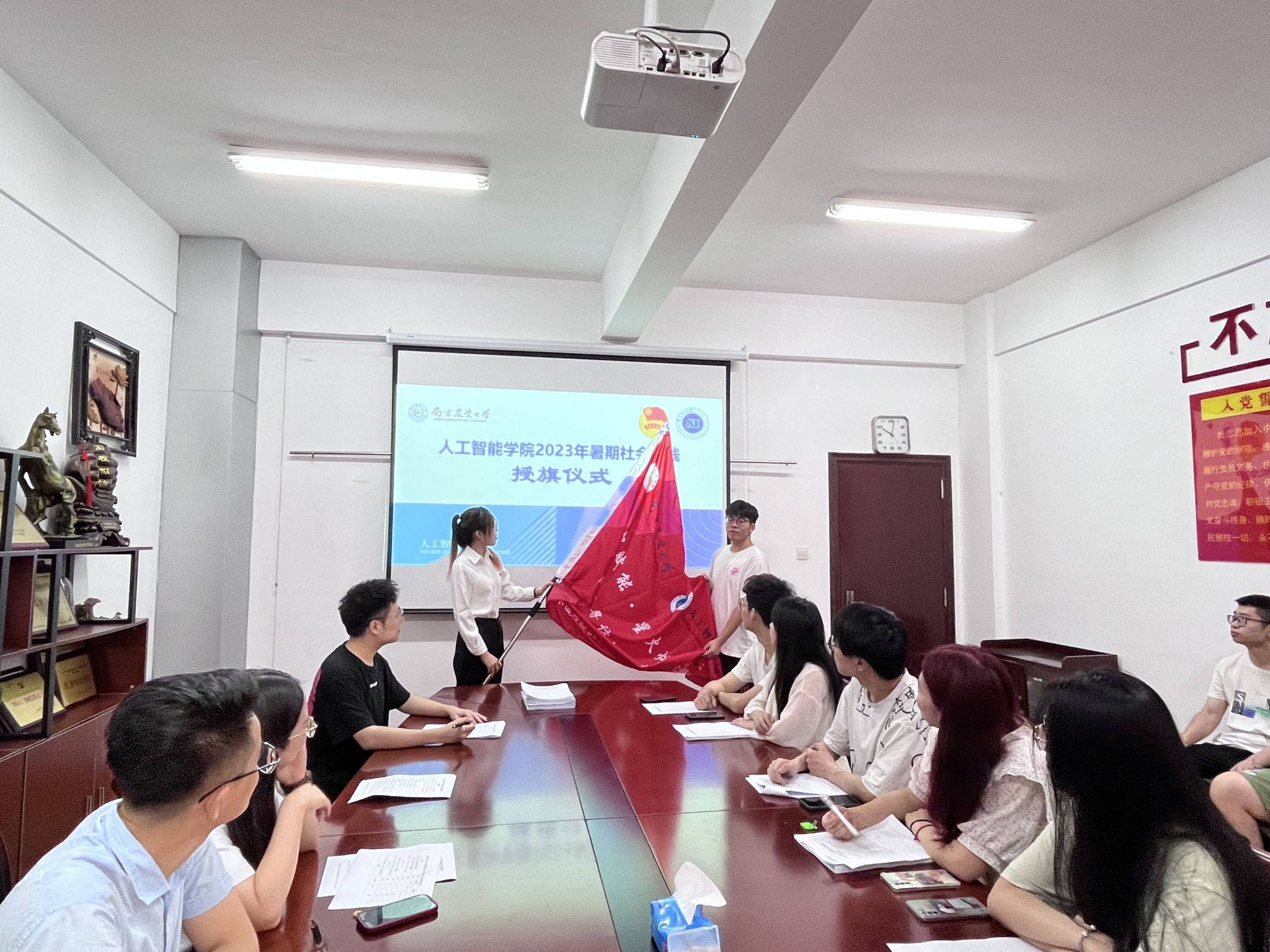 于6月30日在育贤楼B311会议室举行2023年暑期社会实践出征暨授旗仪式。院学生工作办公室主任兼团委书记章棋,院学生工作办公室副主任兼团委副书记湛斌,本科生辅导员李洪、于佳琪出席本次会议。各重点实践团队负责人、信息员参加本次出征仪式。