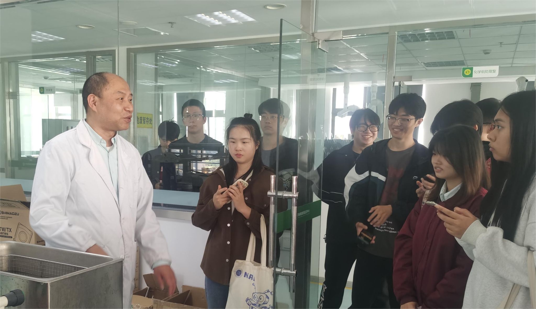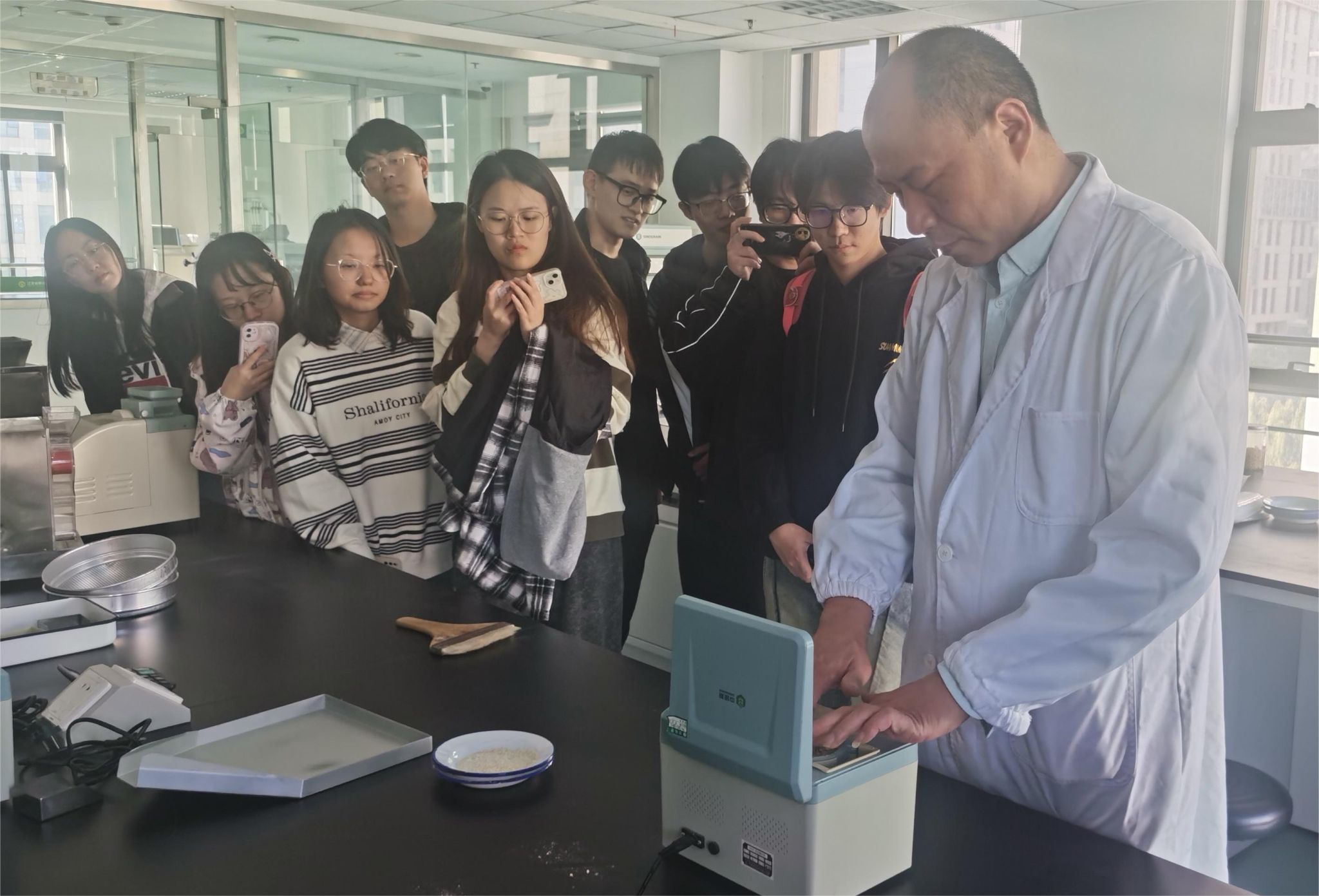 参观现场气氛热烈。研究人员专业与深度并进,讲解了从粮油一体化检测分析设备,到农产品区块链溯源管控的技术变革,极大地拓展了学生对农业信息化智能化的认知。期间,研究员还在介绍稻谷研磨过程时亲自演示,激发了在场同学的学习热情。