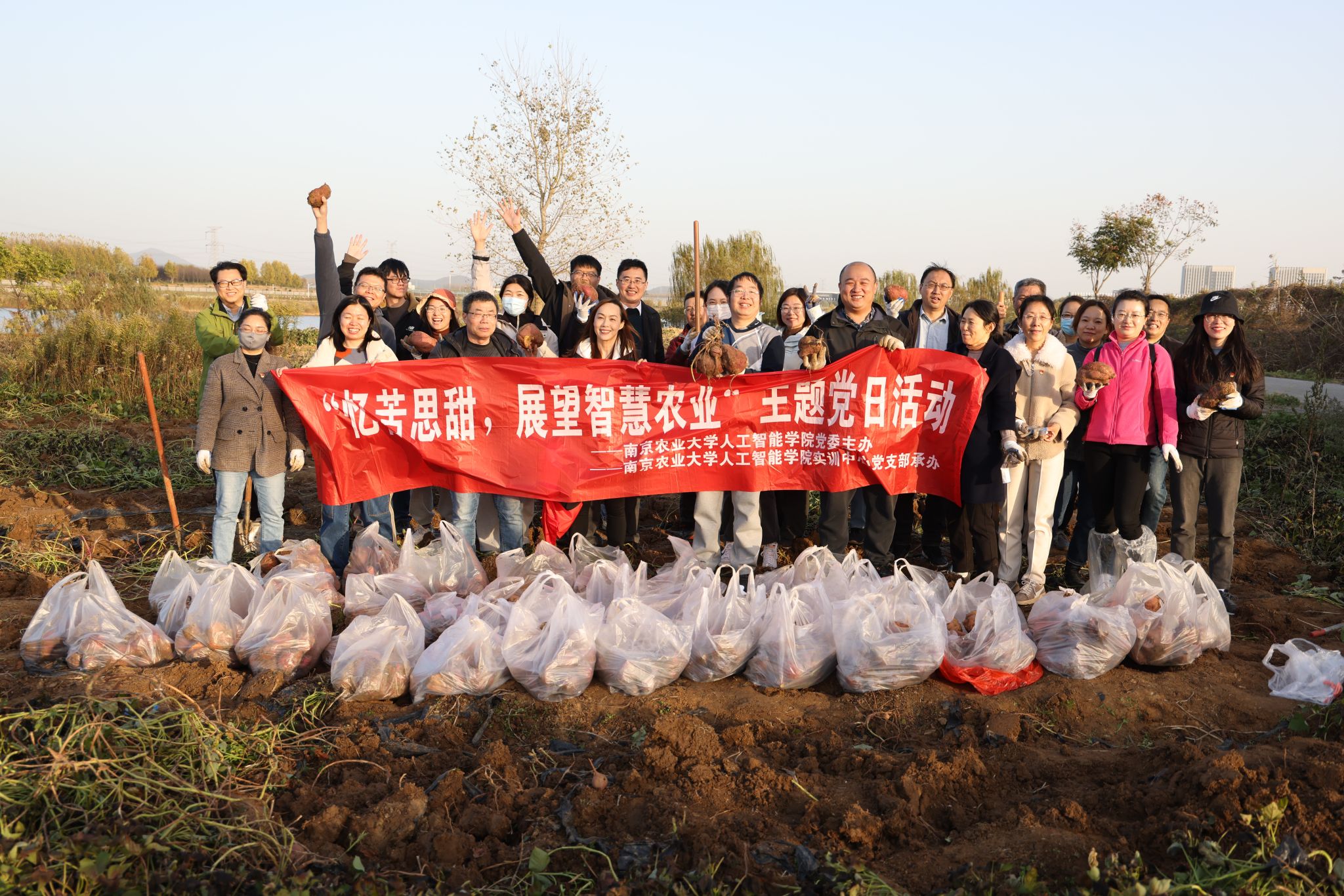 各位老师在基地老师的带领下实地考察参观了白马基地智慧农业设施。在了解白马基地建设发展历程、科研进驻、教学实习、科技服务、文化建设等成果后院党委带领全院各级党员进行采收山芋劳动教育活动。平日里整天和人工智能软硬件打交道的老师们,纷纷卷起袖子拿起铁铲锄头,分工合作。在阳光和汗水中收获着一个个饱满的果实。冬日旷野的风在那一刻已失去了它的威力,阳光洒在每个人的脸上,笑得那么灿烂。晶莹的汗珠落在白马基地的泥土里,融入到老一辈学者们的革命精神中。身上的党徽在冬日的照耀下将不惧困难的红色精神传承下去,带入到我们今后的科研教学工作和生活中。