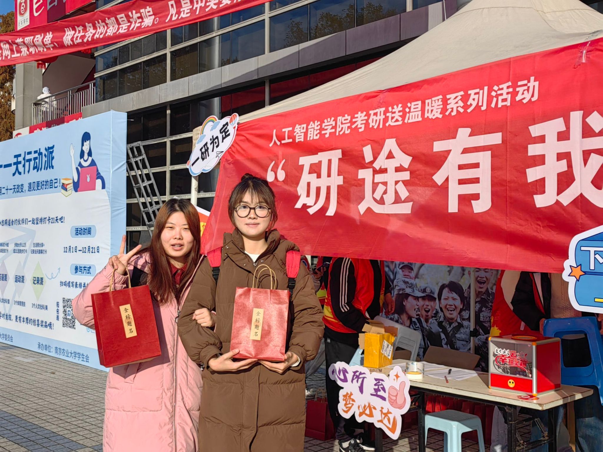 团委青协红会举办的考研送温暖活动在润泽园广场顺利开展,活动吸引500余名同学参与。