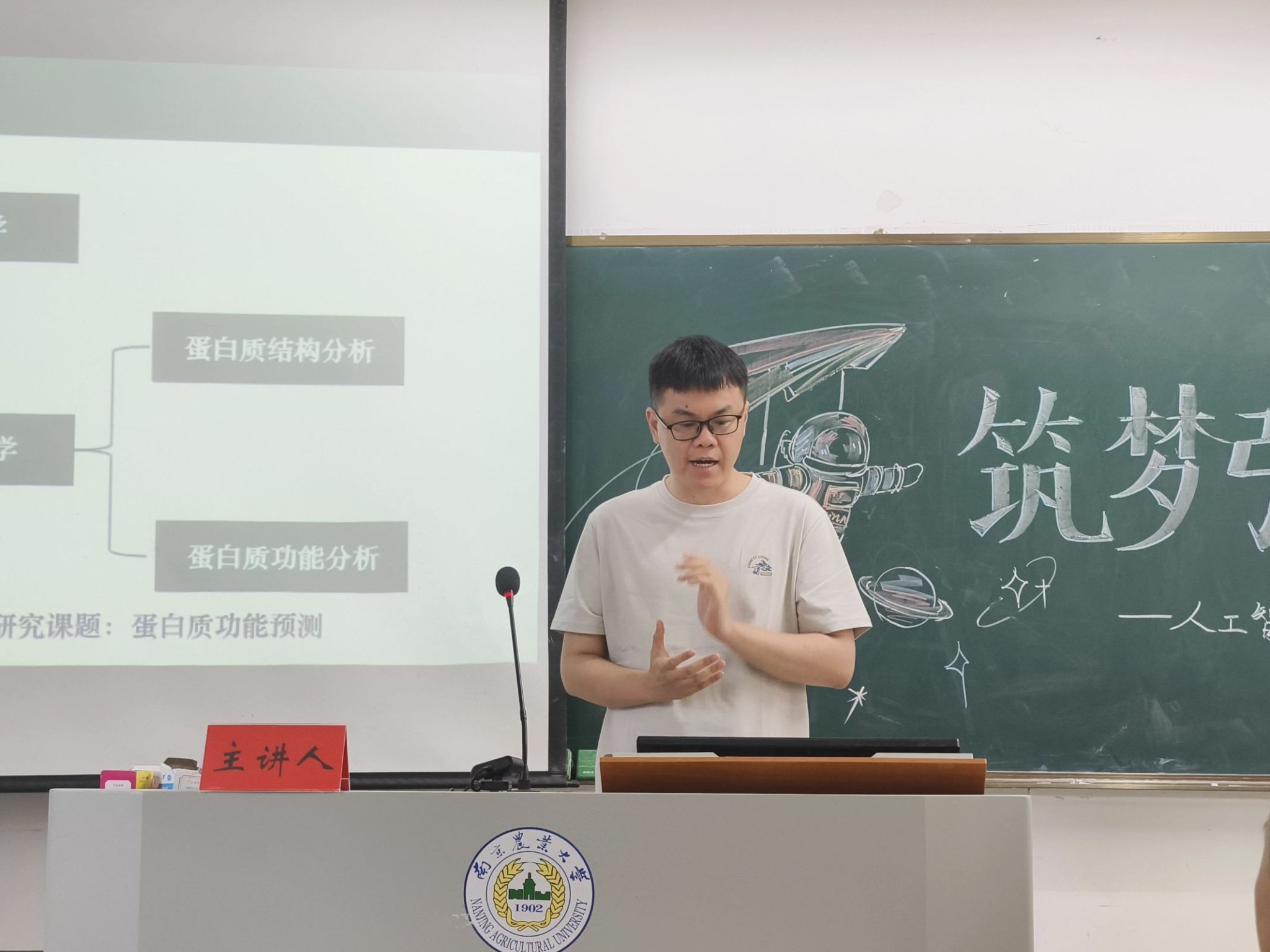 朱一亨老师围绕研究课题“基于人工智能算法的蛋白质功能预测研究”展开详细讲解,从生物信息学体系分类、蛋白质基础知识、蛋白质功能注释面临的挑战、研究该方面所需要的知识储备等多方面进行讲解,让同学们对该研究方向有了更深入的了解,展现了交叉学科的魅力。朱一亨老师鼓励同学们脚踏实地完成自己的学业,为开展科研打下坚实的基础。