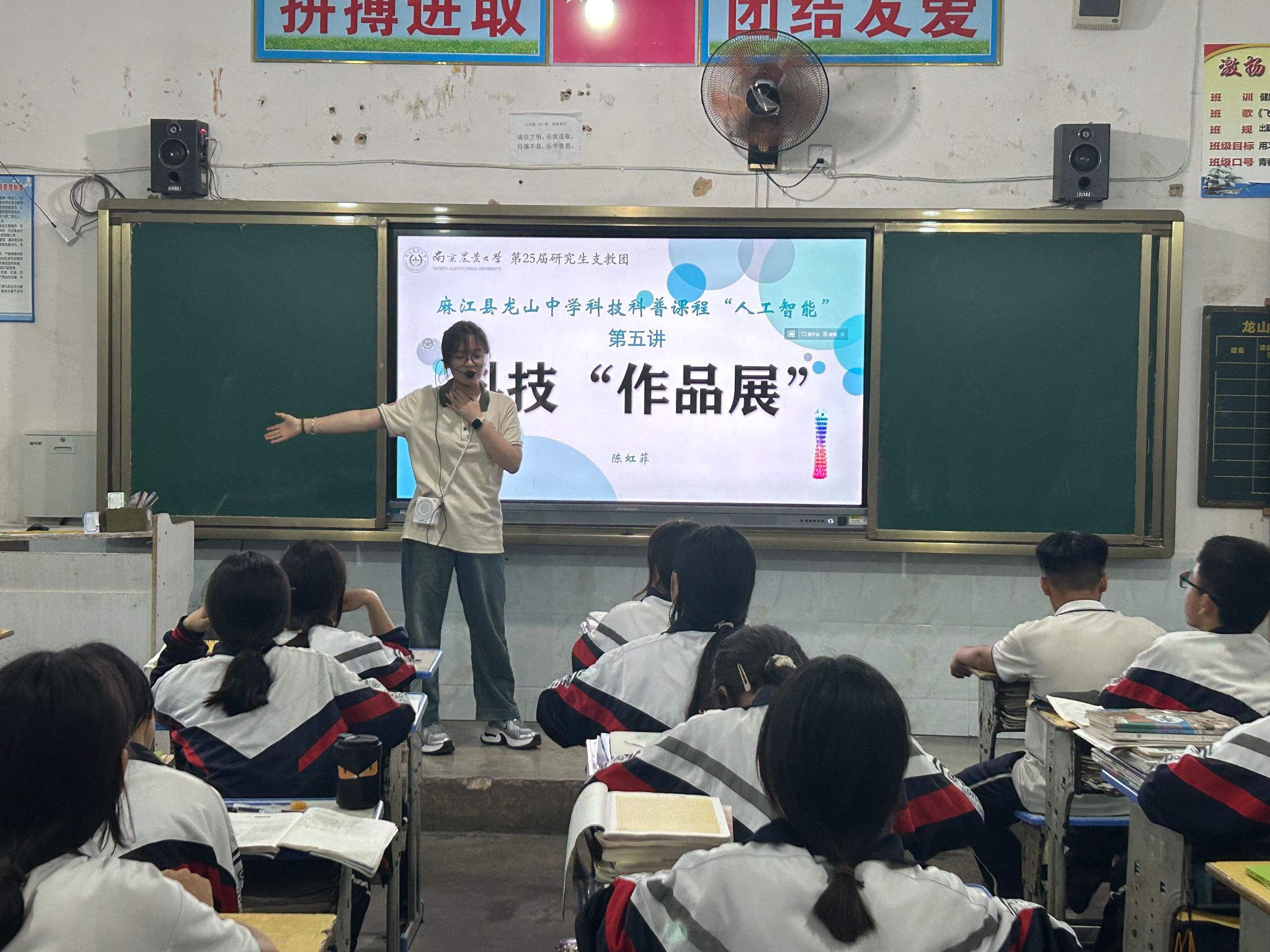 支教志愿者陈虹菲老师充分运用院内外提供的资源,引领中学生们沉浸式实践体验、深度参与进科技小作品的原理认知理解、制作、效果展现等诸多环节,从“智能”视角助力当地中学生们的实践能力提升。