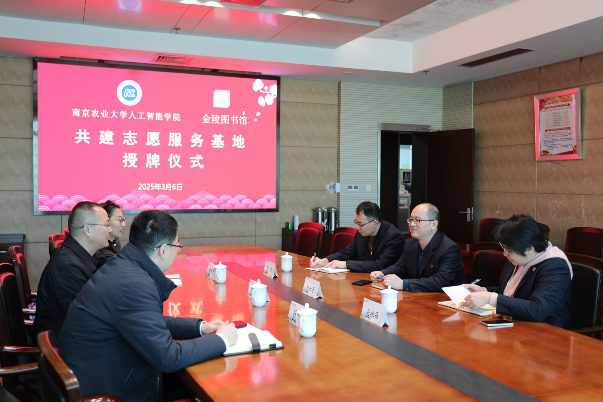 与金陵图书馆洽谈智慧助残志愿服务项目,挂牌成立"志愿服务共建基地"。学院党委副书记吕一雷、教授卢伟、辅导员魏宇宁,金陵图书馆党总支书记尹士亮、分馆建设部主任孙振强、分馆建设部张俊等出席签约仪式,双方就科技助残项目开发、志愿服务体系构建达成深度合作意向。