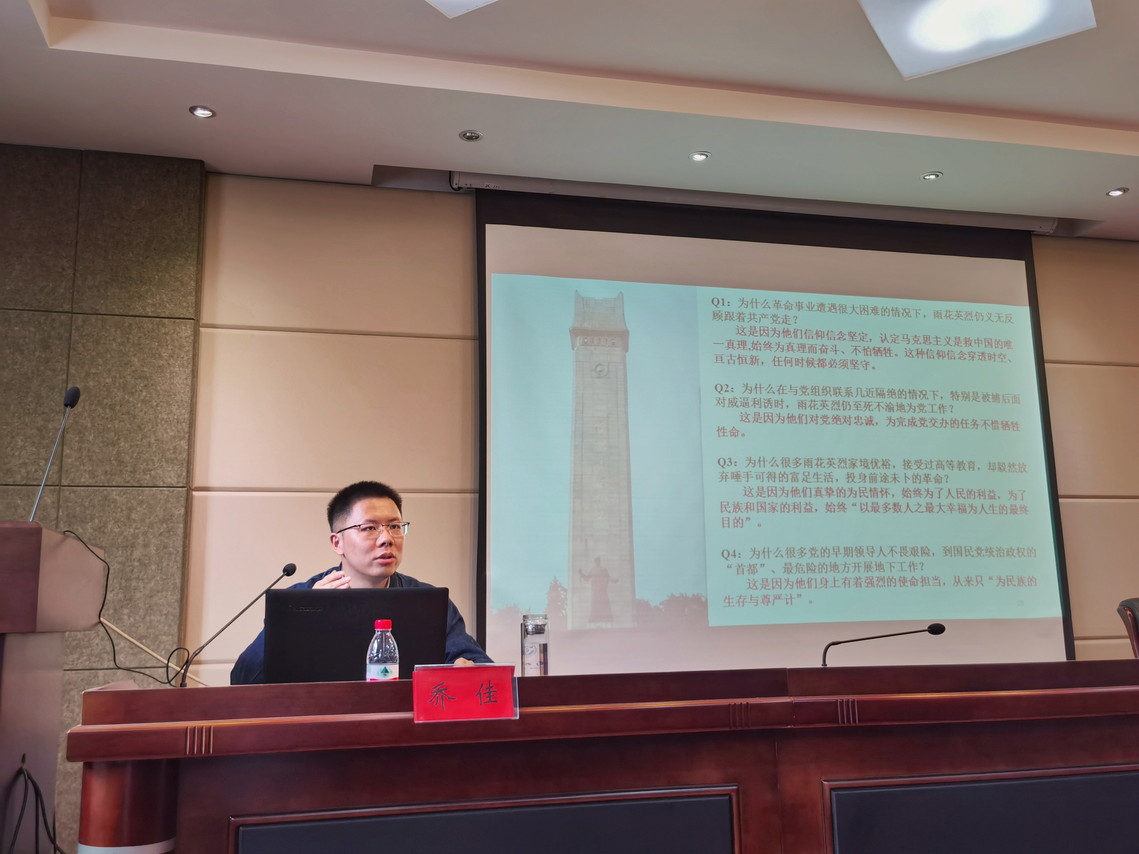 参观结束后,全体党员继续踏上学习之路,前往行政北楼D320听取《雨花英烈精神学习与解读》专题报告。报告会由院党委副书记(主持工作)沈明霞主持,马克思主义学院乔佳应邀作专题报告。乔佳以“为什么要学习雨花英烈精神”为切入点,具体讲述邓中夏、恽代英、何宝珍等雨花英烈的革命事迹,党员们深刻感悟到革命先烈们不畏强敌、不惧风险、敢于斗争、勇于胜利的风骨和品质。接着,乔佳借用四个“为什么”,深入全面地介绍雨花英烈精神深刻含义及其当代价值。在新的历史条件下,弘扬雨花英烈精神要多样化、机制化、常态化,使英烈精神成为实现中华民族伟大复兴的强大精神动力。