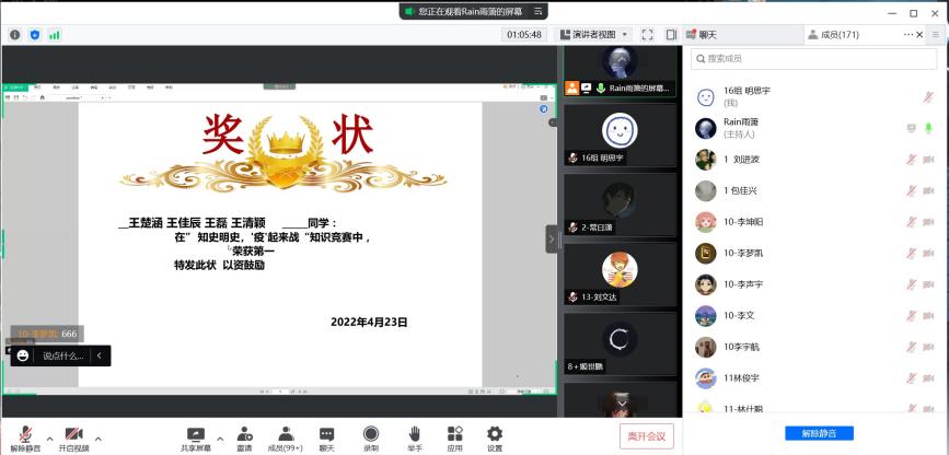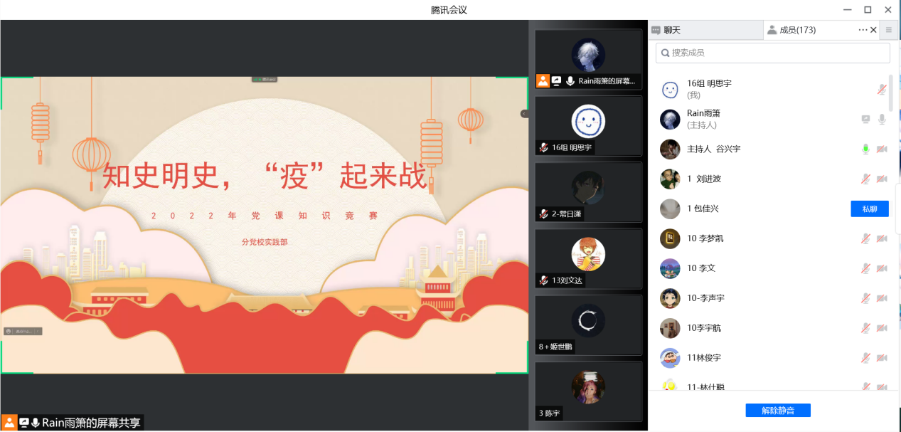 首先,各位积极分子通过学习通平台,在规定时间内完成必答题。随后在主持人的引导下,通过腾讯会议进行线上抢答,得分以小组形式进行统计。比赛现场答题氛围激烈,积极分子们抢答积极,回答迅速,且总体正确率较高,充分展现了扎实的知识储备和奋勇争先的精神风貌。最终,来自第二十组的王楚涵,王佳辰,王磊,王牧言,王清颖五位入党积极分子在整场比赛中表现突出,略胜一筹,荣获第一名。