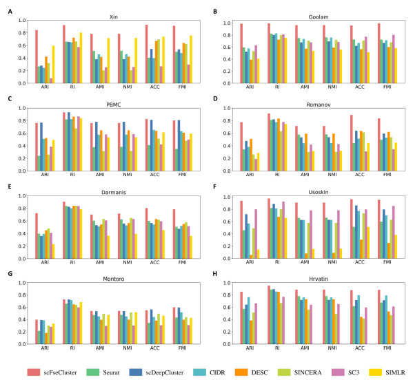 图2. scFseCluster与其他7中SOTA方法的聚类性能对比