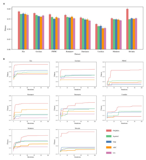 研究人员首先证明了FSQSSA用于基因选择的优越性能。他们在上述八个公共数据集上对比了FSQSSA与四种群智能搜索算法分别用于基因选择的性能差异。从图1可见,FSQSSA算法获得的最优基因集的适应度值明显优于其他四种算法(图1A)。此外,FSQSSA 还表现出极快的收敛速度,能以很少的迭代次数收敛到最优基因集(图1B)。