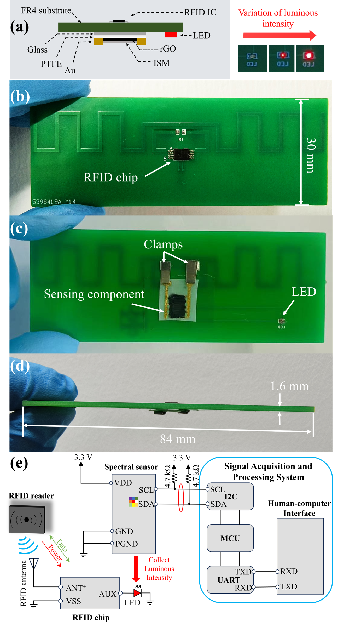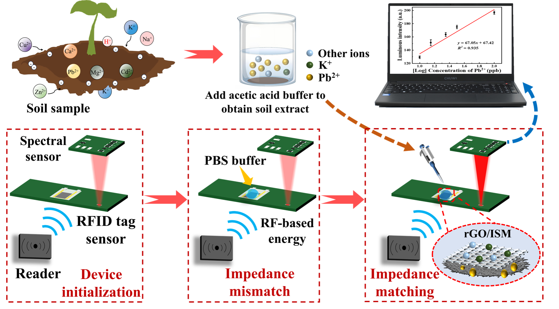 围绕农业土壤重金属污染危害生态安全和公众健康(重金属经作物富集可引发人体神经损伤、肾脏病变)这一问题,面向传统检测技术依赖实验室大型仪器(如ICP-MS)、流程繁琐、成本高昂这一行业瓶颈,南京农业大学赵国副教授团队成功研制首套集成化无线无源射频土壤铅污染检测系统。该系统结合还原氧化石墨烯(rGO)和复合铅离子选择性敏感膜(ISM),构筑异质传感单元——当土壤浸出液中的Pb²⁺被rGO/ISM特异性吸附后,其电子传输特性改变将触发RFID标签式传感器的阻抗变化,通过射频阻抗失配原理,将阻抗失配度转化为RFID传感器上626 nm LED光源的发光强度;内置微尺度光谱芯片即可对光强数据进行即时解析,通过建立动态光-浓度关联模型,实现最快2秒的铅浓度精准检测(检测限达1.96 μg/L)。与ICP-MS测试数据的交叉验证实验表明,其检测回收率达99%-101%,均方根误差均小于5.2 μg/kg。该技术摒弃传统矢量网络分析仪等笨重外设,采用模块化可插拔结构和可替换传感组件,大大降低检测成本;配套研发的便携式检测设备为土壤重金属污染防治提供"早发现、早治理"的智能化解决方案。
