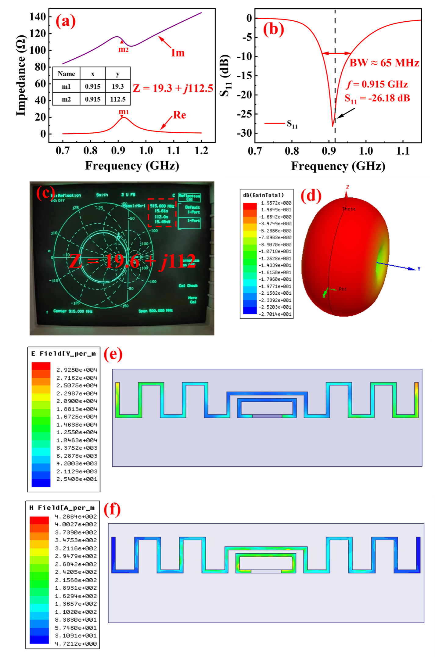 图3 RFID标签传感器天线的阻抗和回波损耗等射频参数模拟和测试分析