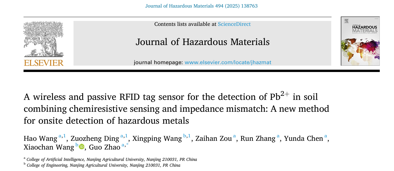赵国副教授团队在国际知名期刊《Journal of Hazardous Materials》(IF=12.2,中科院1区Top)上发表了题为“A wireless and passive RFID tag sensor for the detection of Pb2+ in soil combining chemiresistive sensing and impedance mismatch: A new method for onsite detection of hazardous metals”的研究论文,报道了结合化敏电阻传感和射频阻抗匹配的土壤重金属无线无源检测技术的研究成果。
