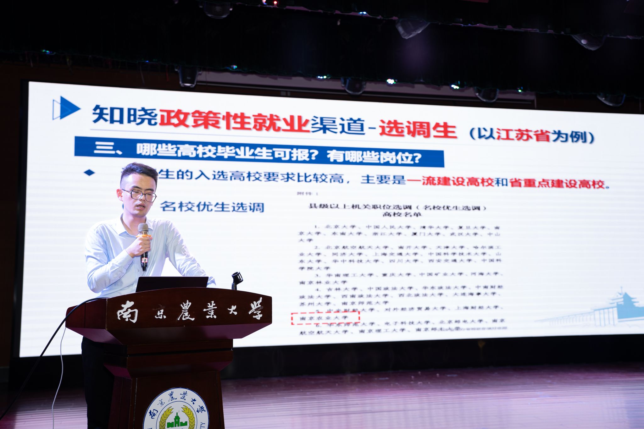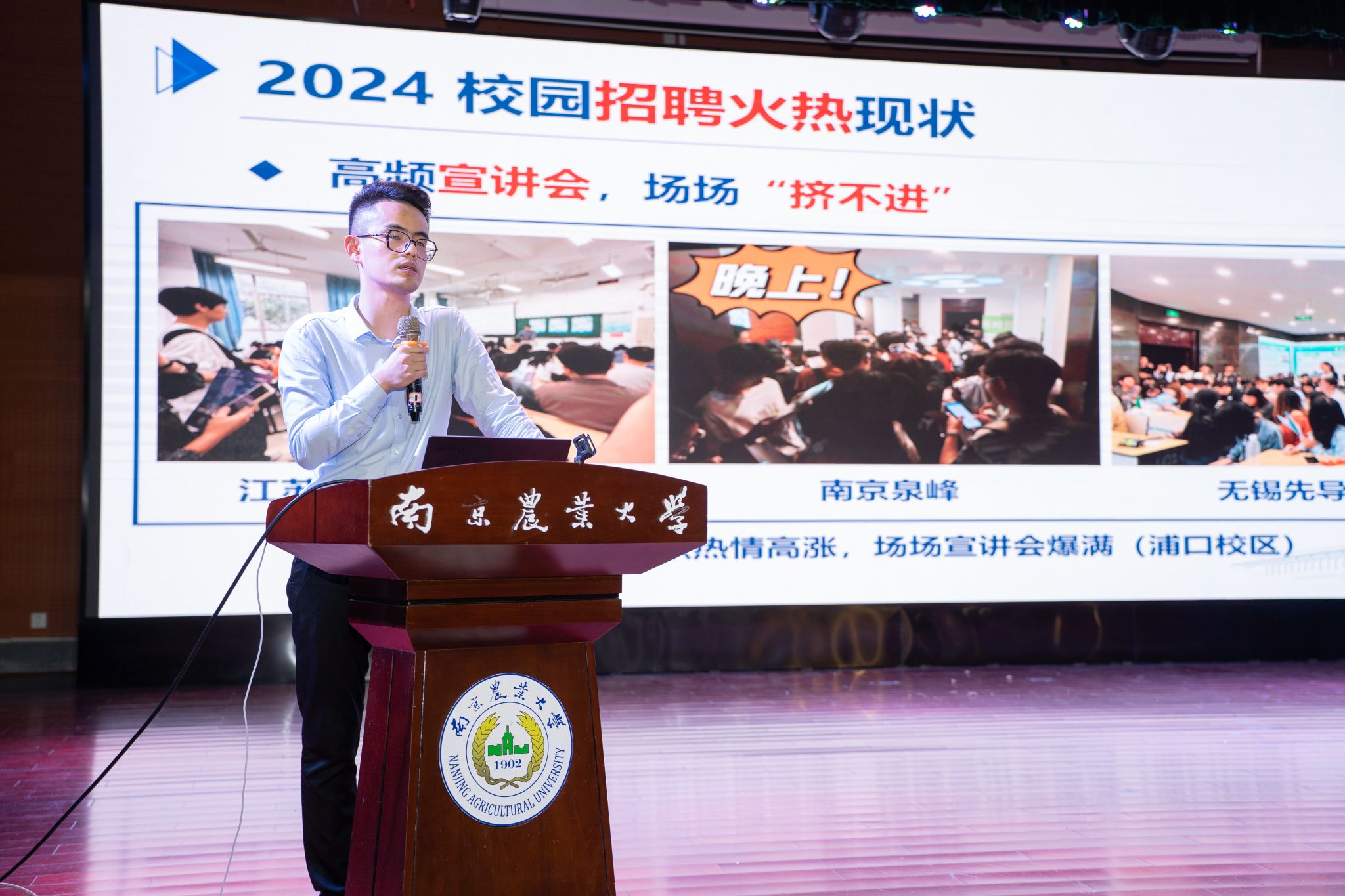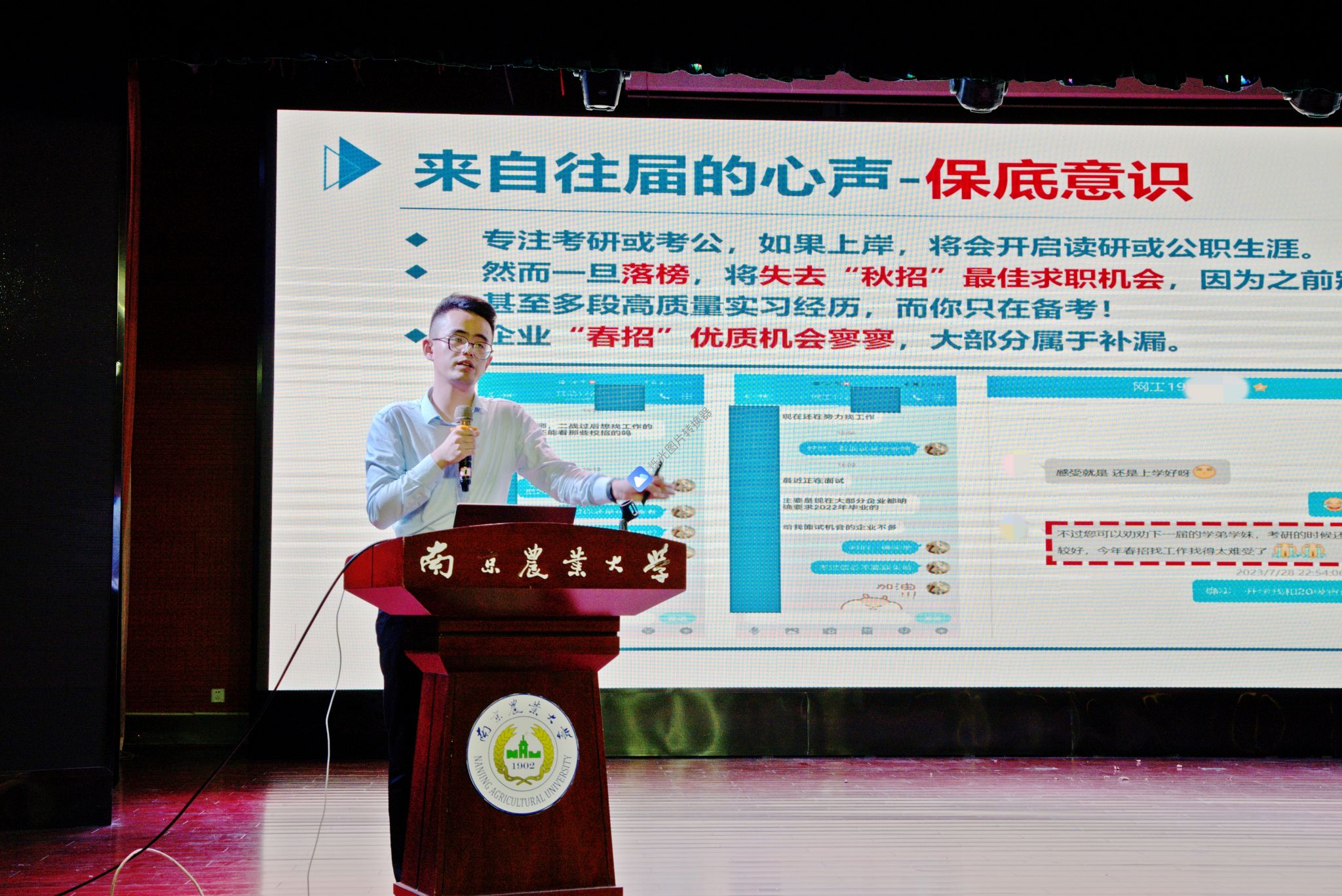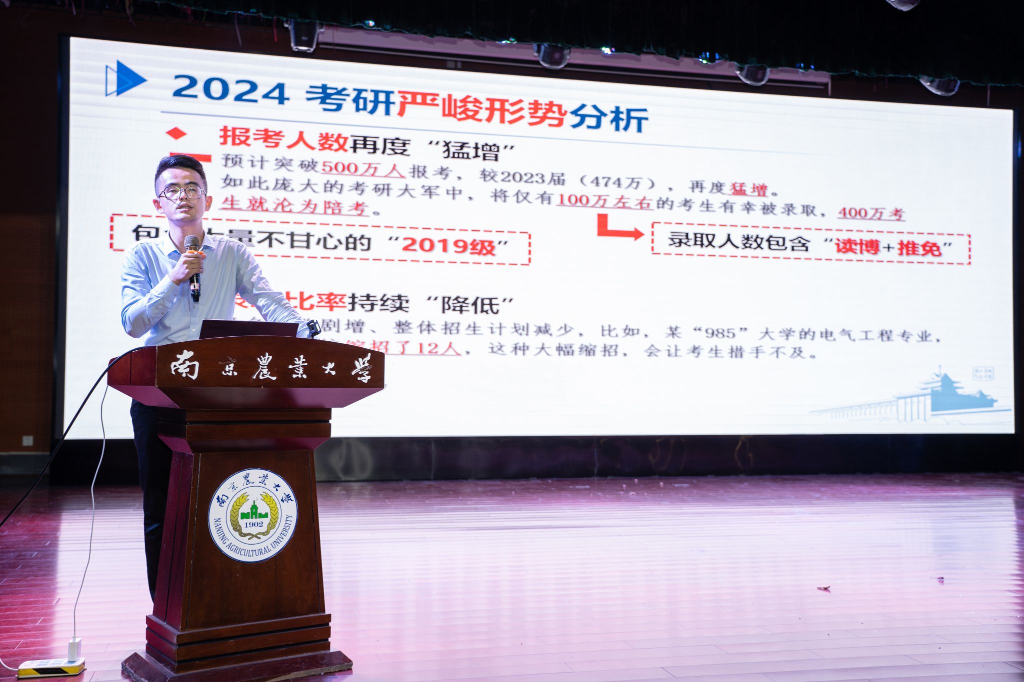 随后,湛斌从2024届考研形势与对策、就业形势与对策、简历质量提升、面试技巧指导、求职心态调适等方面展开宣讲。过程中,他结合当下的就业升学形势,对学院往届升学、就业情况着重进行了较为深入分析。此外,他针对“选调生”“应届身份”“三方协议”等毕业生重点关注的问题,进行了详细解答与阐释。