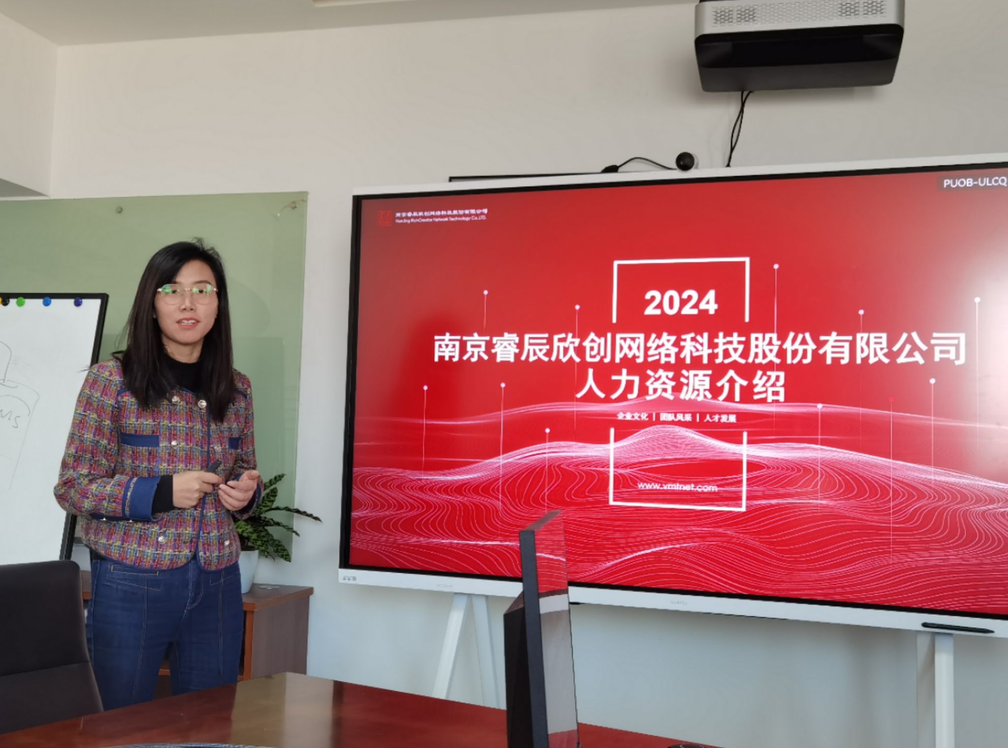 移步会议室,销售部负责人杨阳、人力资源部负责人黄金芳,分别介绍了睿辰欣创的基本情况、发展历程、产品体系、永利皇宫赌场、人才发展培训体系、薪酬福利体系及2024届应届毕业生的招聘需求等。